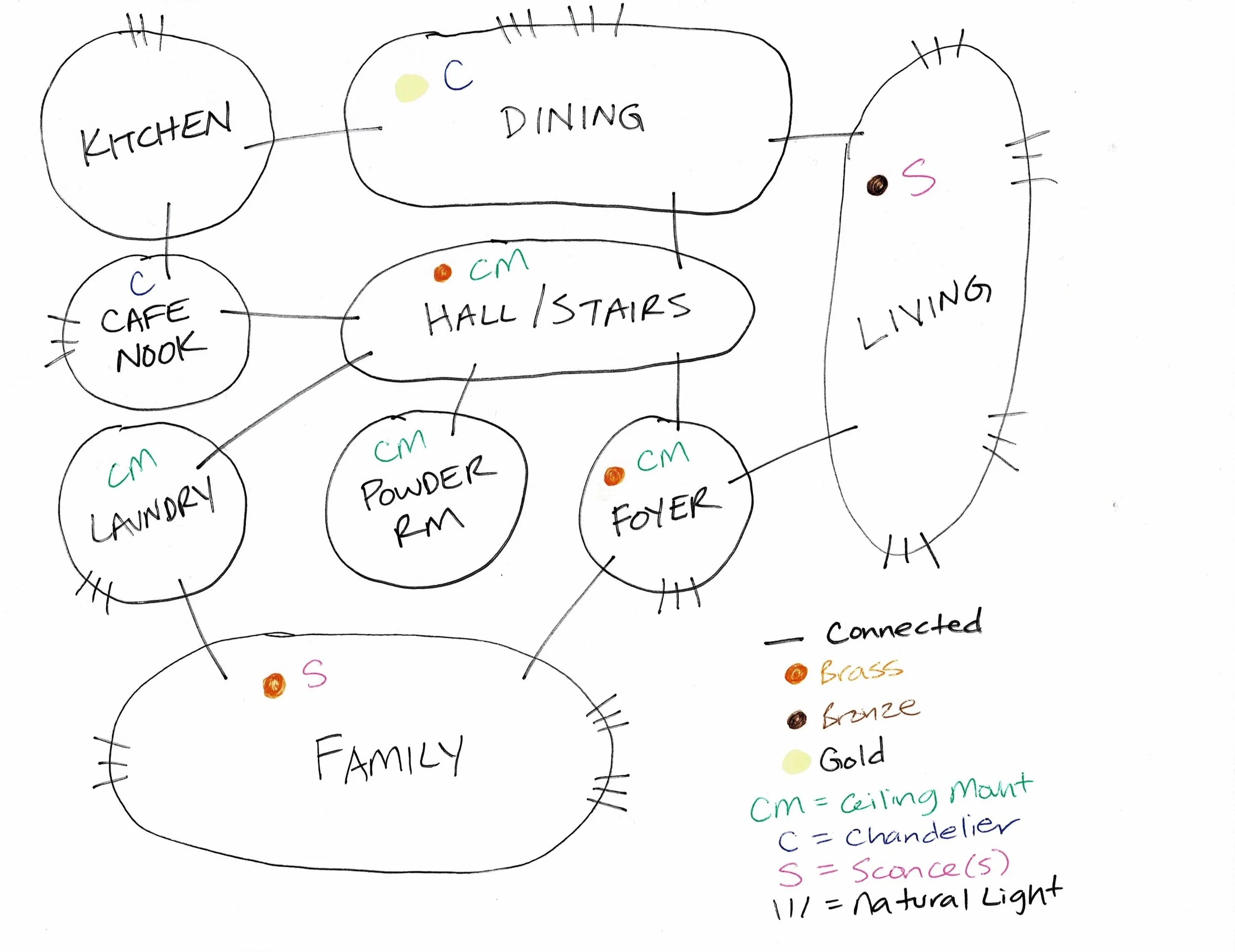 A final option is to create what we designers call a bubble diagram. Typically these are used before space planning if a designer is creating a new floor plan as it helps them envision how they want spaces to connect and flow. But it can also be great for developing your design concept. You can make a legend of symbols, color code it, or just write keywords that represent the main inspiration ideas, elements and principles you want to achieve. This can also be a great alternate version of the floor plan option as you can draw each space's bubble in relation to where it is in the house, allowing you to see how design elements flow from space to space.