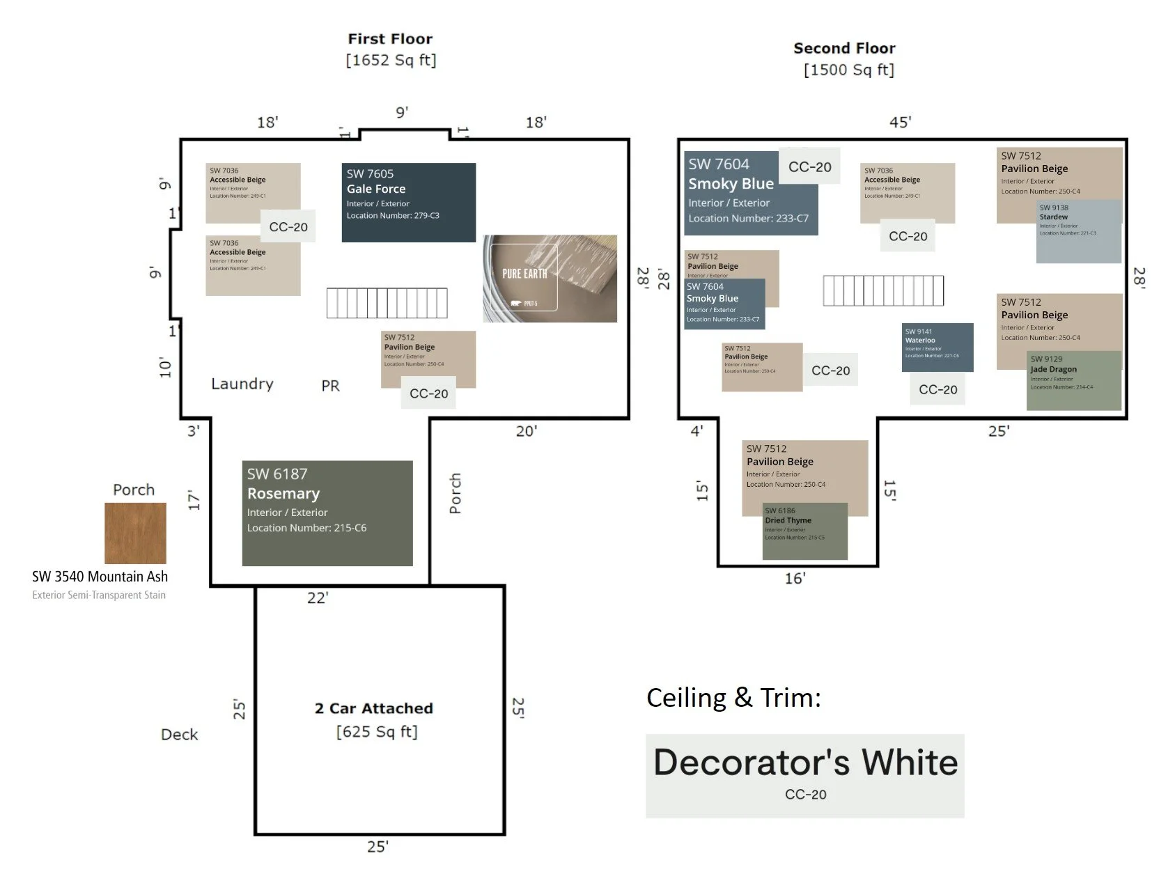 Here is my example of taking a floor plan (in this case, the home appraiser’s drawing) and placing paint colors in each room. You will see most have two colors (one for the walls and one for the trim and/or ceiling). I created this in Google Slides, using snips/screenshots from the paint company’s website and pasting them onto the slide.