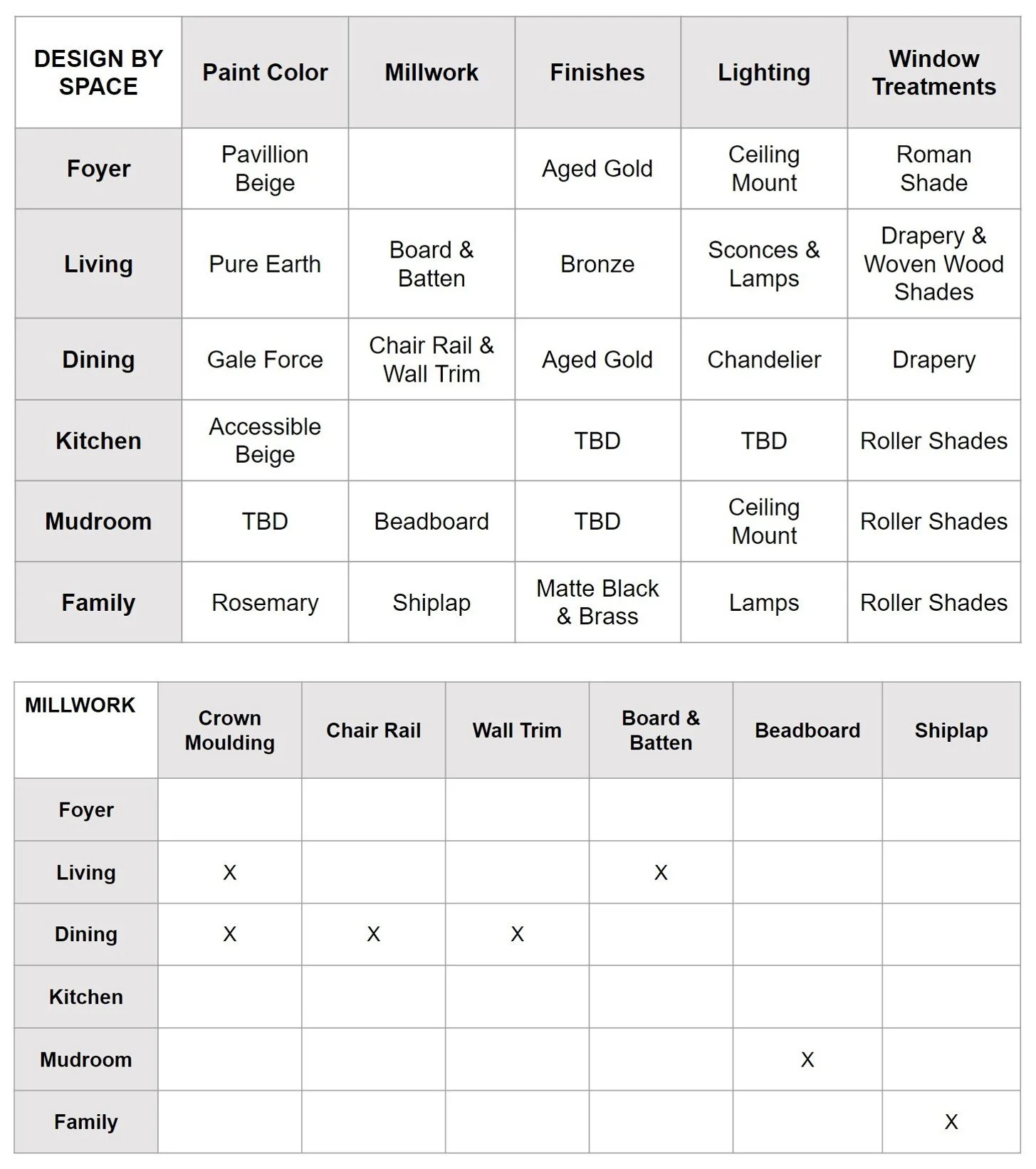 Designers sometimes create similar tables in packets we refer to as “spec sheets”, which outline all specifications for the trades working on the project.