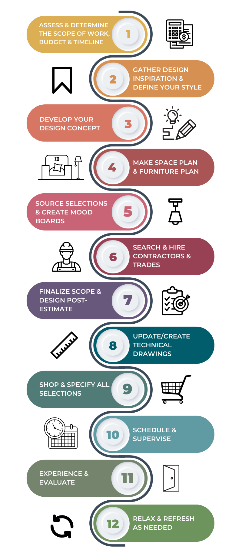 Tasks you need to complete (design decisions, sourcing selections, design appointments, ordering, supervising)